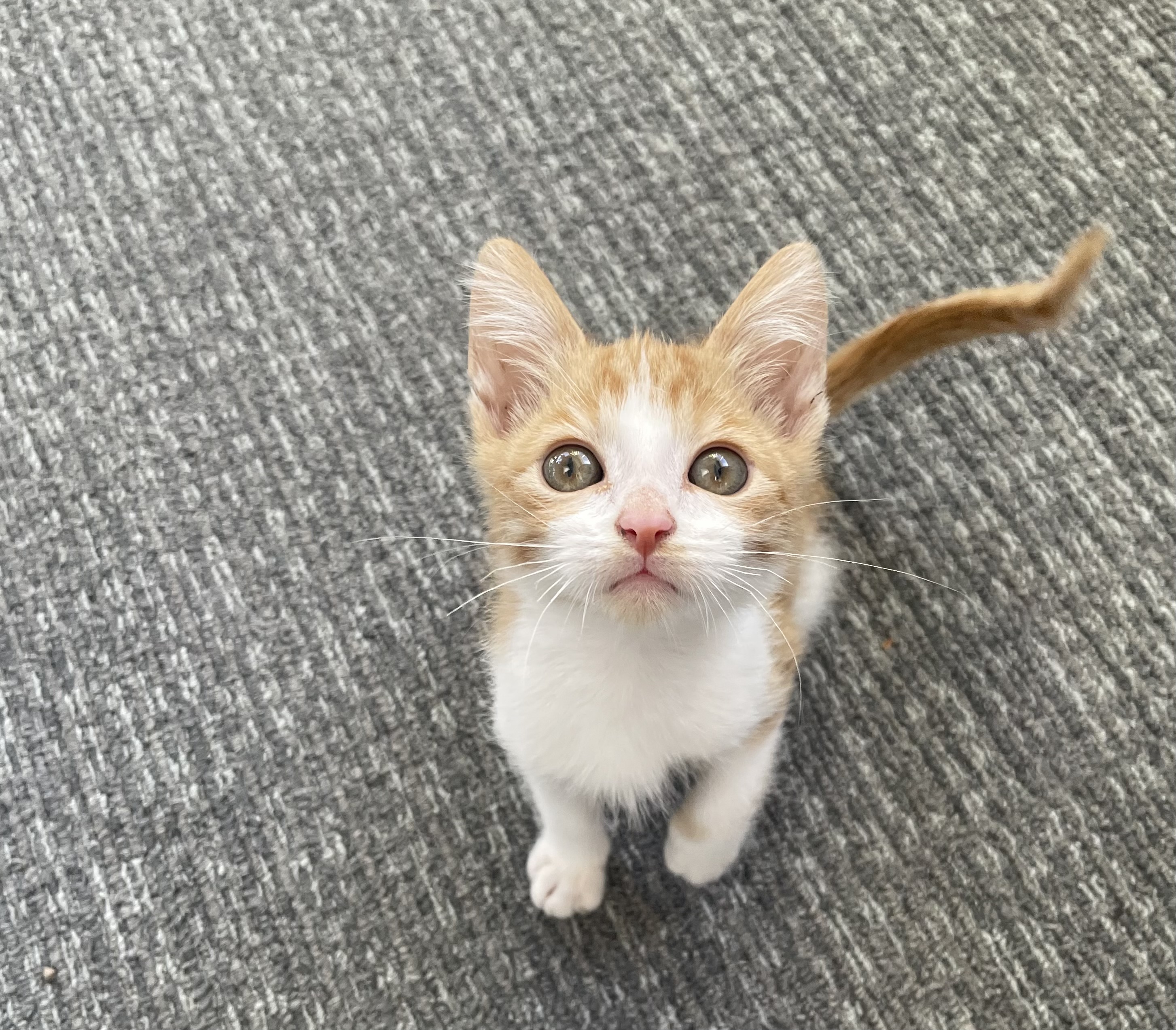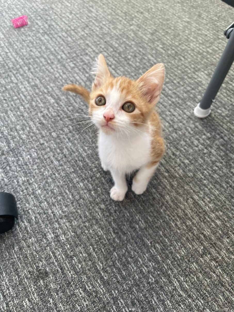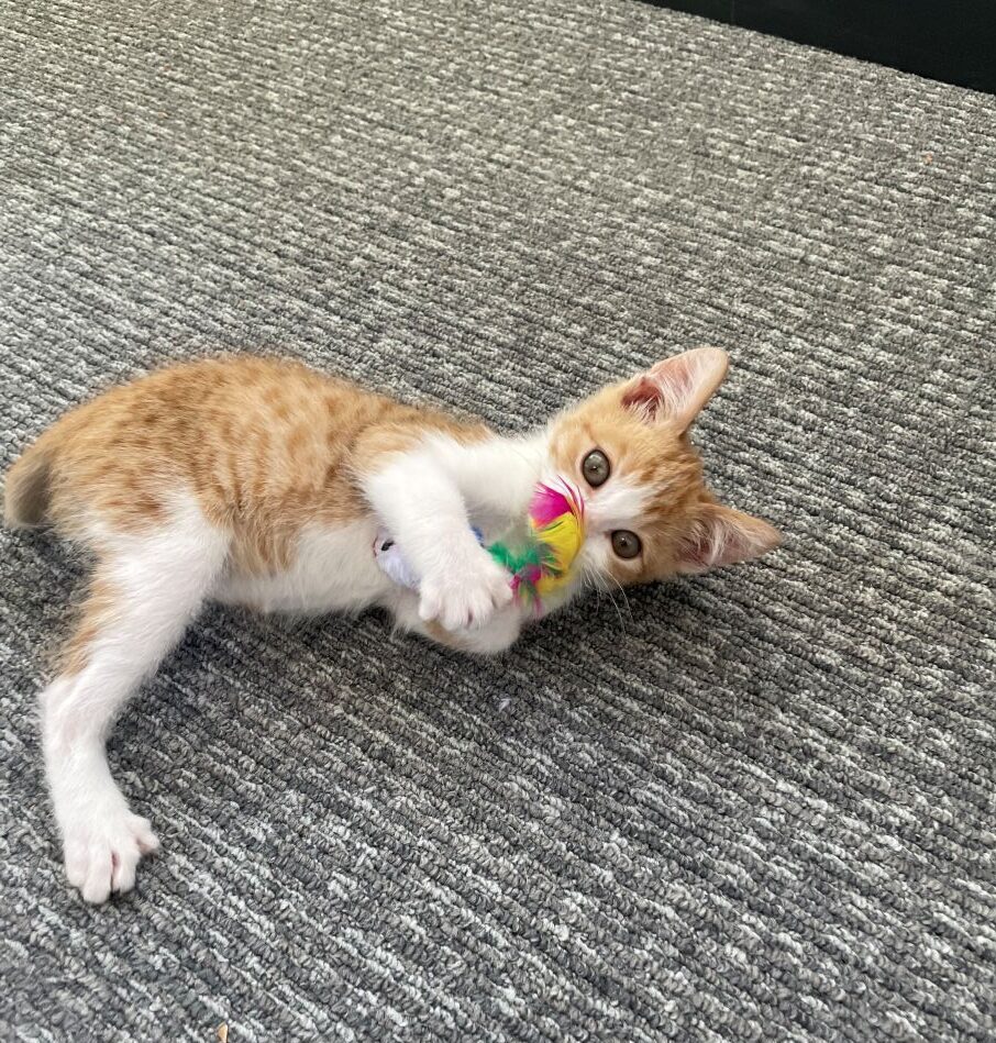 I’m a tiny orange cutie with all the sweetness of fall bundled into one playful kitten! I’m full of purrs, curiosity, and bouncy kitten energy. My favorite activities include chasing toys, exploring new spots, and greeting you with purrs. When I’m all tuckered out, I turn into the snuggliest little gourd, ready to curl up in your lap and warm your heart.