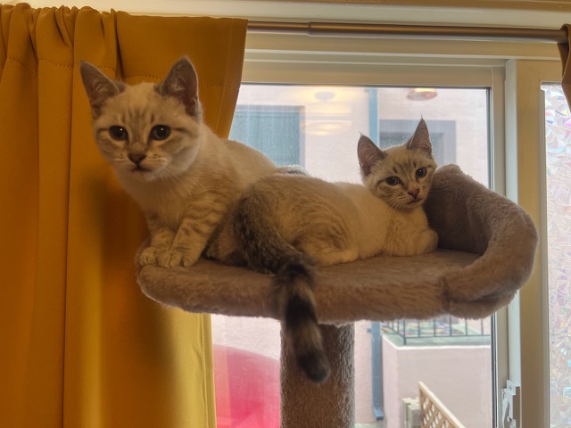 Hi, we’re Phoebe (female, lynx point) , Fiona (female, lynx point) and Jet (male, black)!