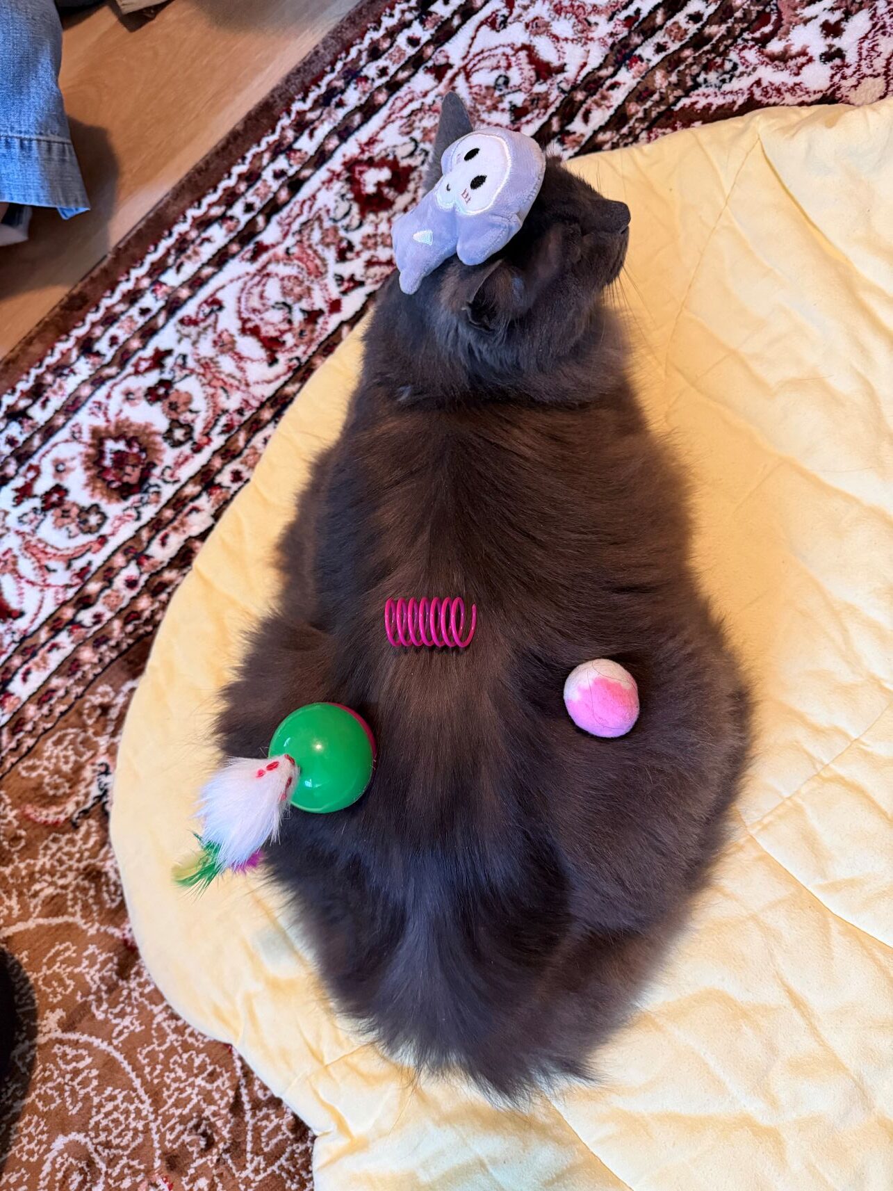 Napping, Being pet, Toys, Window watching, Being an indoor cat, Sitting in your lap