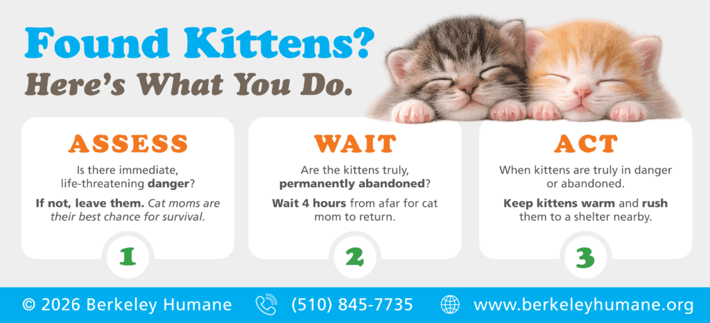 Keeping animals safe is Berkeley Humane’s top priority. This guide offers basic steps for helping kittens in your neighborhood, but local animal control agencies may have specific recommendations for your area.